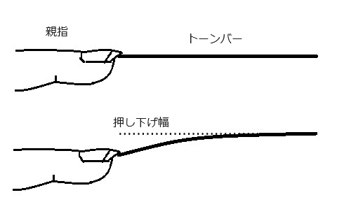 これは、トーンバーによって押し下げ幅を変えるという意味ではありません。 同じ強さで弾いても、低音のトーンバーは長いので、しなり易いからです。